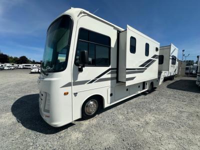 Sleeps 6 Slides 2 Length 29 ft 11 in Ext Width 8 ft 5 in Ext Height 12 ft 5 in Int Height 7 ft Interior Color Ashbrook Exterior Color Standard Graphics Hitch Weight 5000 lbs GVWR 18000 lbs Fresh Water Capacity 72 gals Grey Water Capacity 50 gals Black Water Capacity 49 gals Tire Size 245/70R19.5G Furnace BTU 30000 btu Generator 4,000W Fuel Type Gasoline Engine Triton 7.3L EFI V-8 Premium Chassis Ford F53 Horsepower 335 hp Fuel Capacity 80 gals Available Beds King Torque 468 ft-lb Refrigerator Type 12V Refrigerator Size 10 cu ft Convection Cooking Yes Cooktop Burners 2 Shower Size 30" x 36" Number of Awnings 1 LP Tank Capacity 56 lbs Water Heater Capacity 6 gal Water Heater Type Gas/Electric DSI AC BTU 15000 btu TV Info LR 39" LED HD Smart TV Awning Info 18' Electric with LED Lights Gross Combined Weight 23000 lbs Shower Type Standard Electrical Service 30 amp Similar Motor Home Class A Floorplans
