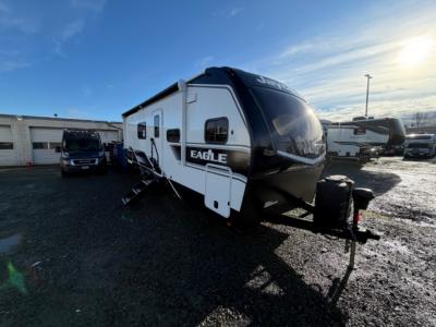 With any Eagle HT fifth wheel or travel trailer by Jayco you will enjoy a smooth drive thanks to the 4 Star Handling Package and MORryde CRE-3000 rubberized suspension. The Customer Value Package includes amenities that are sure to make camping easier than ever, like the 60K on-demand water heater, Keyed-Alike lock system, 15,000 BTU "Whisper Quiet" A/C, and more. Handcrafted door/drawer fronts will make your space feel more like home, along with residential vinyl flooring throughout, GE appliances, and blackout roller shades with reflective side throughout to keep the sun out when you want to sleep in. Each model also includes a NuVo H2O water treatment system with filters included, interior and exterior "Blue Sync" audio connect with MB Quart Sound for your TV and phone, and 100% no floor vents for added comfort and convenience!