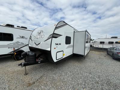 The Jayco Jay Flight SLX travel trailer is quite easy to own because it is lightweight for an easier towing experience. Built on a fully integrated A-frame with galvanized-steel, impact-resistant wheel wells, the Jay Flight SLX has quality at its very foundation. That quality continues on to the electric self-adjusting brakes, easy-lube hubs, Magnum Truss roof system, and LP quick connect. Some of what the mandatory Customer Value Package includes is backup camera prep, Keyed-Alike entry and baggage doors, and an on-demand tankless water heater.