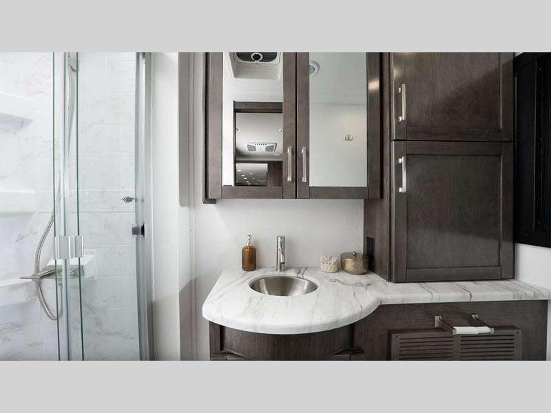 The JRide Plus will provide precise handling and stability as you travel across the state or country, and the Stronghold VBL lamination is the lightest, yet strongest construction in the industry so you can enjoy your coach for all your adventures. There are solid surface kitchen countertops inside, along with decorative kitchen backsplash, hardwood cabinet doors, and large wardrobes to easily store your belongings.
