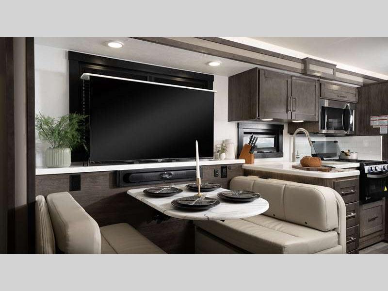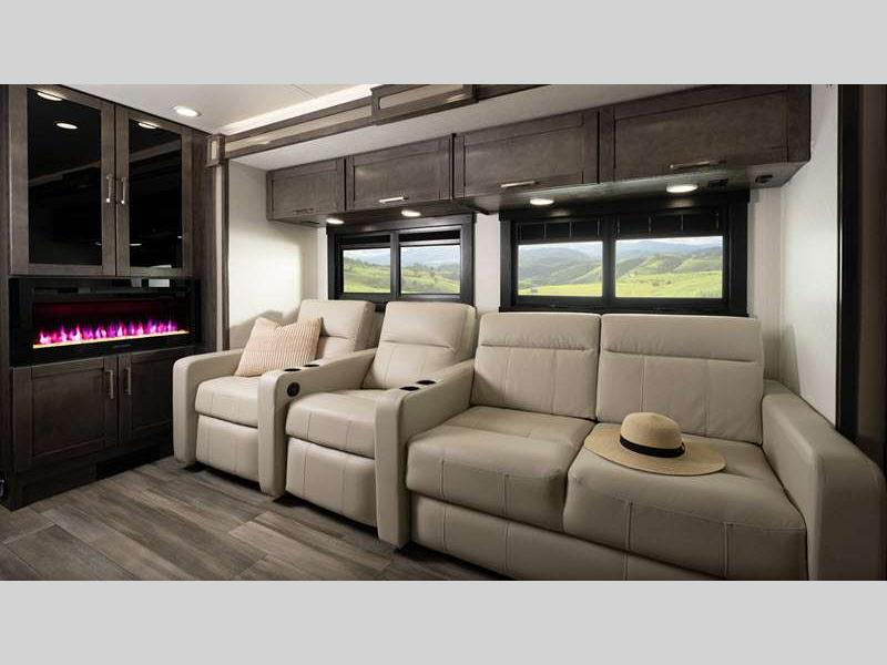 Sleeps 5 Slides 3 Length 38 ft 10 in Ext Width 8 ft 5 in Ext Height 12 ft 10 in Int Height 7 ft Interior Color Benton, Modern Farmhouse Exterior Color Standard Graphics. Full-Body Paint; Blackbird, Cardinal, Bluebird Hitch Weight 5000 lbs GVWR 24000 lbs Fresh Water Capacity 72 gals Grey Water Capacity 72 gals Black Water Capacity 72 gals Tire Size 255/80R22.5G Furnace BTU 60000 btu Generator 5,500-Watt Fuel Type Gasoline Engine 7.3L V8 Chassis Ford F53 Horsepower 335 hp Fuel Capacity 80 gals Available Beds King Torque 468 ft-lb Refrigerator Type Residential Cooktop Burners 3 Shower Size 30" x 36" Number of Awnings 1 LP Tank Capacity 16.5 gals Water Heater Type Suburban Tankless AC BTU 28500 btu Basement Storage 134 cu. ft. TV Info LR 50" LED HD Smart TV on Lift, BR LED HD Smart TV, Ext. LED HD Smart TV Awning Info 20' Electric with LED Lights Washer/Dryer Available Yes Gross Combined Weight 30000 lbs Shower Type Standard Electrical Service 50 amp Solar Wattage 200 watts Similar Floorplans