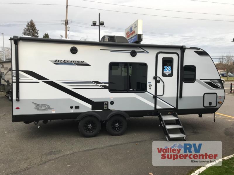 With any Jay Feather travel trailer by Jayco, you will enjoy lightweight towing, convenient exterior amenities, and at-home comforts inside! The Overlander 1 Solar Package included within the Jay Sport Package comes with a 200W solar panel and a 30-amp digital controller so you can enjoy some off-grid camping. There is also a modern graphics package with a dual-colored sidewall, LCI Solid Step fold-down aluminum tread steps on the main entry door, and Climate Shield 0 -100° F tested weather insulation package that will allow you to camp in all sorts of climates. The Customer Value Package will make time outdoors easier than ever with a power tongue jack and a Rock Solid stabilizer system, plus American-made nitro-filled Goodyear tires with self-adjusting electric brakes. More exterior features include a Keyed-Alike locking system, marine grade exterior speakers, a Magnum Truss roof system, and the list goes on! And we haven't even touched on the interior comforts, like the residential style seamless countertops and vinyl flooring throughout, decorative backsplash, handcrafted hardwood door/drawer fronts, and multiple USB charging ports to keep you going!