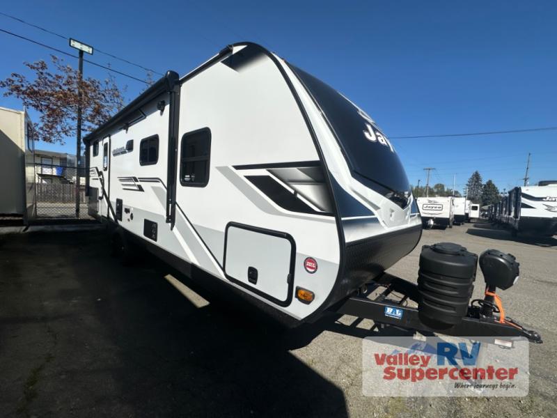 With any Jay Feather travel trailer by Jayco, you will enjoy lightweight towing, convenient exterior amenities, and at-home comforts inside! The Overlander 1 Solar Package included within the Jay Sport Package comes with a 200W solar panel and a 30-amp digital controller so you can enjoy some off-grid camping. There is also a modern graphics package with a dual-colored sidewall, LCI Solid Step fold-down aluminum tread steps on the main entry door, and Climate Shield 0 -100° F tested weather insulation package that will allow you to camp in all sorts of climates. The Customer Value Package will make time outdoors easier than ever with a power tongue jack and a Rock Solid stabilizer system, plus American-made nitro-filled Goodyear tires with self-adjusting electric brakes. More exterior features include a Keyed-Alike locking system, marine grade exterior speakers, a Magnum Truss roof system, and the list goes on! And we haven't even touched on the interior comforts, like the residential style seamless countertops and vinyl flooring throughout, decorative backsplash, handcrafted hardwood door/drawer fronts, and multiple USB charging ports to keep you going!