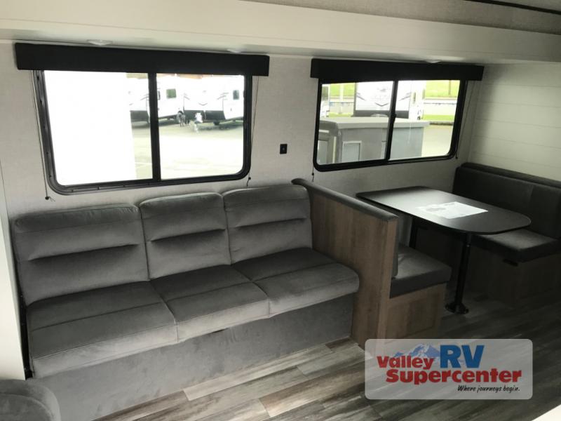You can comfortably sleep up to six people in this trailer thanks to the RV queen bed in the front bedroom, plus the booth dinette and jack-knife sofa in the main living area! The chef of your crew will have a three burner cooktop and microwave oven to prepare meals, and everyone can store their favorite drinks in the 8 cu. ft. 12V refrigerator. The walk-through bath is spacious and includes a radius shower, toilet, a sink, and linen closet and is the full width of the unit. The outside storage will let you bring along camp chairs and games, fishing poles and more, plus the 18' power awning with LED lights will create a nice place to gather in the evenings!