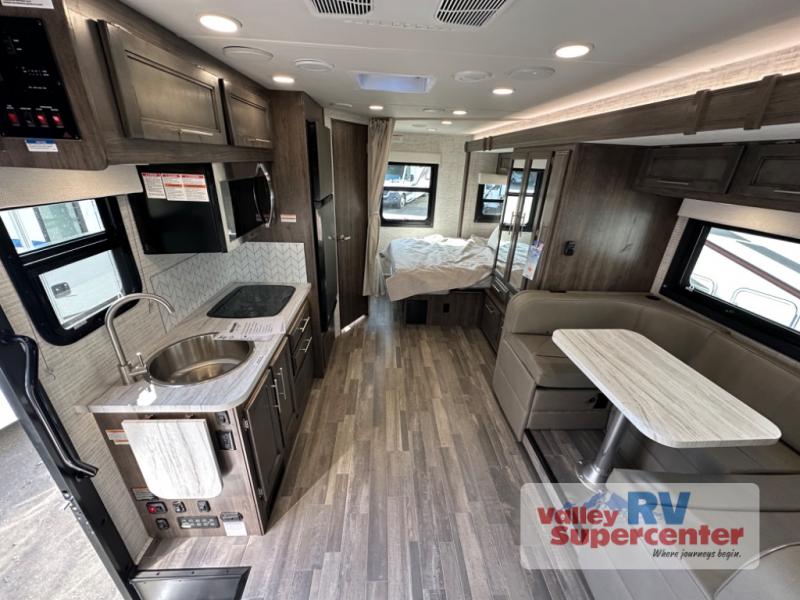 Each Melbourne Class C diesel motorhome by Jayco features durable Stronghold VBL lamination, bead-foam insulation, and a seamless front cap that resists wear and tear from the elements. The 2L V4 twin turbo 211HP diesel engine with 332 ft. lb. torque will power your trips near and far, and the Mercedes-Benz chassis is ultra durable. There are seatbelts in all designated seating locations, and the captain's seats swivel around so they can become a part of the living area once parked. You'll appreciate the LP generator on board, as well as a 13,500 BTU A/C and a 30,000 BTU furnace to keep you comfortable year around. The interior of the Melbourne will have you feeling right at home with high-intensity LED lights, an 83" interior height with a padded vinyl ceiling, hardwood cabinet doors and drawers, and more!