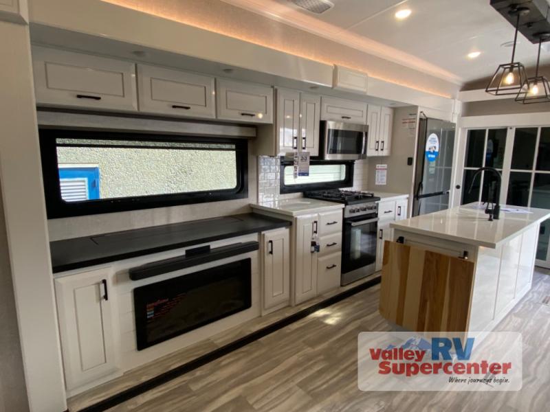 Your search is over now with this perfect luxury fifth wheel for your crew of four. Once you get settled at the campground, take a load off on the theater seat sacross from the TV lift and fireplace. There is also a free-standing table here and a tri-fold sofa that will double as additional seating and sleeping space. The kitchen island includes a pull-out cutting board extension for tons of prep space and even a dishwasher for easy clean up, and a residential range to use for cooking as well as a convection microwave oven with built-in air fryer. Head to the full bath that includes a walk-in shower with a seat, an LED backlit custom framed mirror, plus residential bath backsplash for added luxury. You're gong to love the front private bedroom with its king bed slide out, 32" TV, plus a large front closet complete with a hamper and drawers, and an area that features washer/dryer prep in case you wish to add that convenience as well.