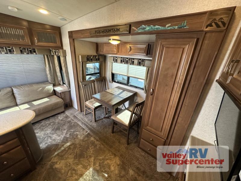 Get out and explore the best places to see with this Fox Mountain! Once you have arrived at the perfect spot, setup the 15' Carefree Travel'R 12V LED awning with adjustable pitch, and the slide out which includes the booth dinette and pantry. You can convert the dinette to a 40" x 72" sleeping area if needed for overnight guests after dining or playing games. Relax on the rear jackknife sofa with decorative pillows and two end tables to set your cellphone and beverages on or whip up a meal in the kitchen with an L-shaped counter top. The split bathroom includes a shower and sink along one side, a private toilet on the other, and a curtain to close for privacy that leads you into the front bedroom where you can sleep on the NW TruRest queen mattress, and there is a nightstand and wardrobe for your belongings.